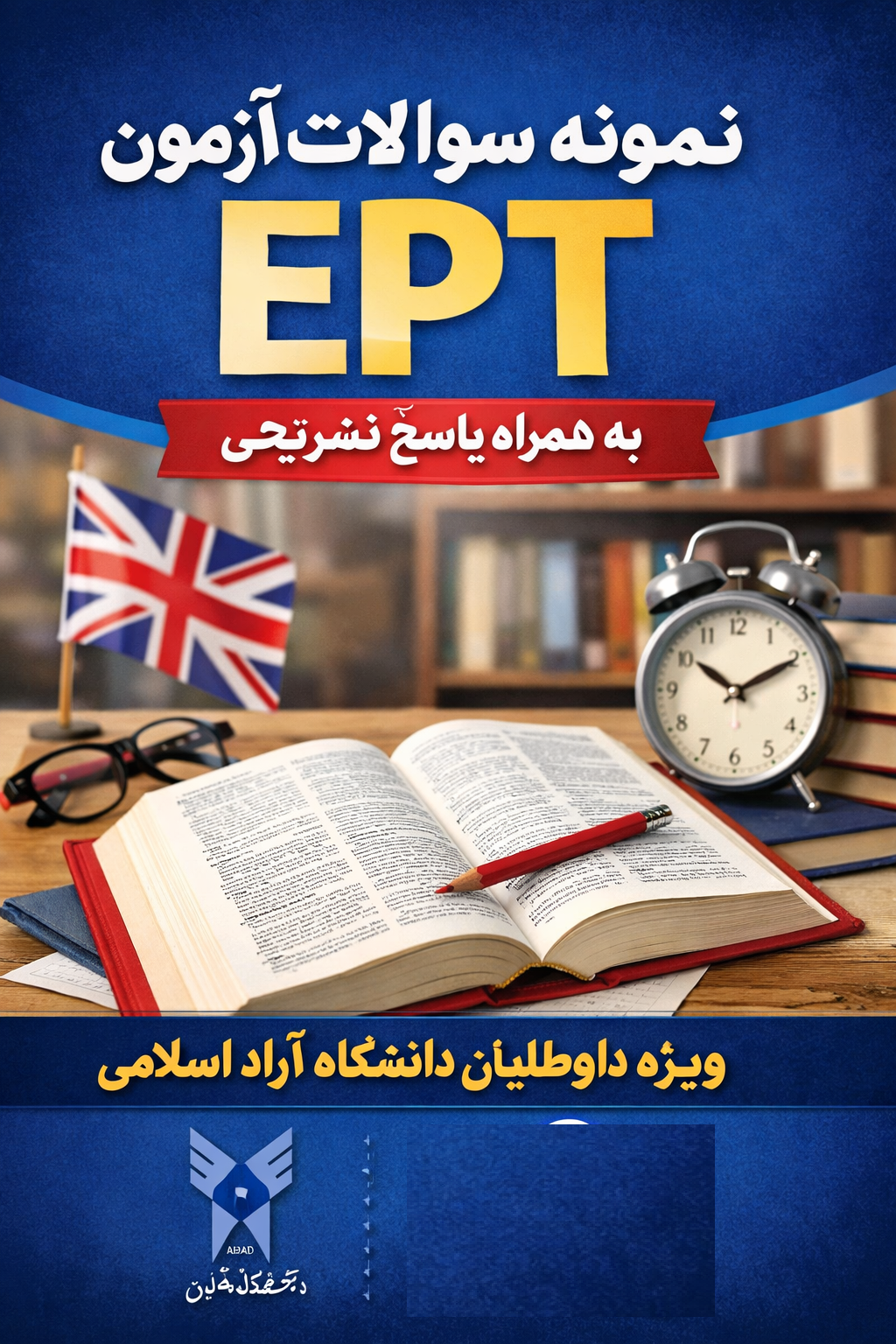 هر سؤال شامل پاسخ تستی (گزینه صحیح) و پاسخ تشریحی آموزشی است و کاملاً در سطح و سبک آزمون EPT دانشگاه آزاد طراحی شده است.